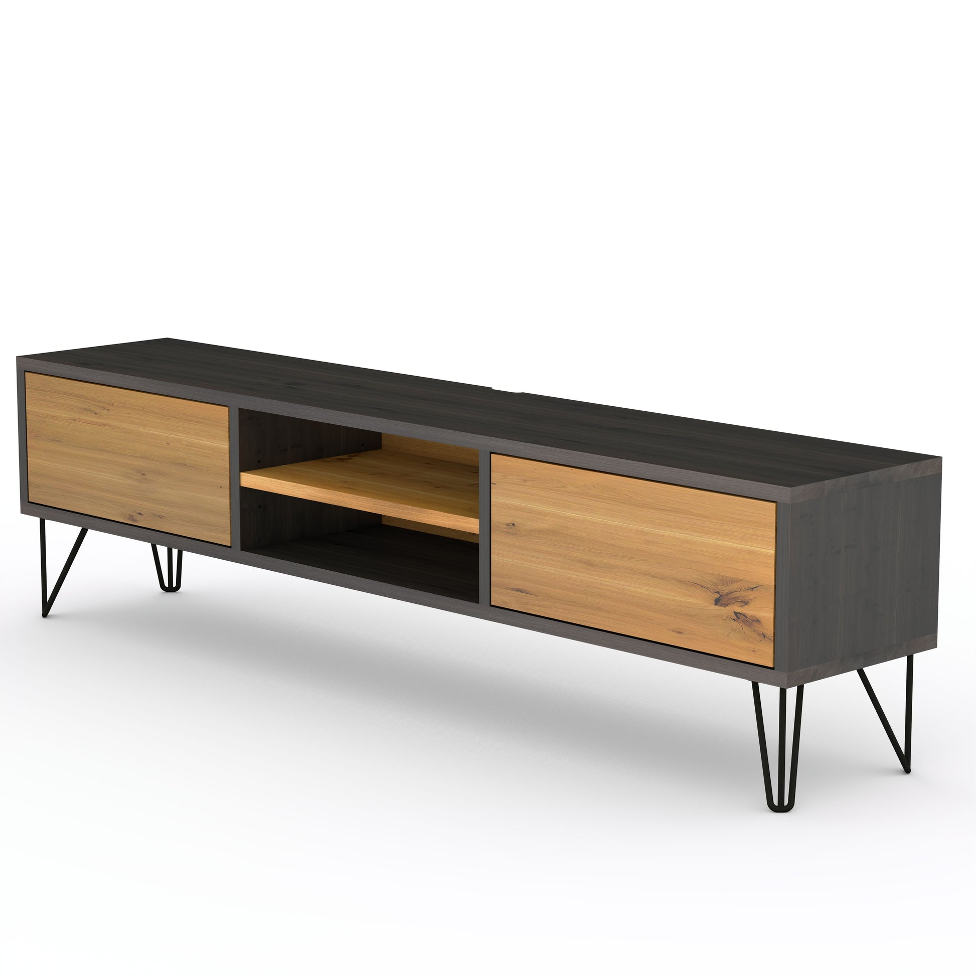 Lowboard aus massiver Eiche – mit filigranem Stahl-Stangenfuß