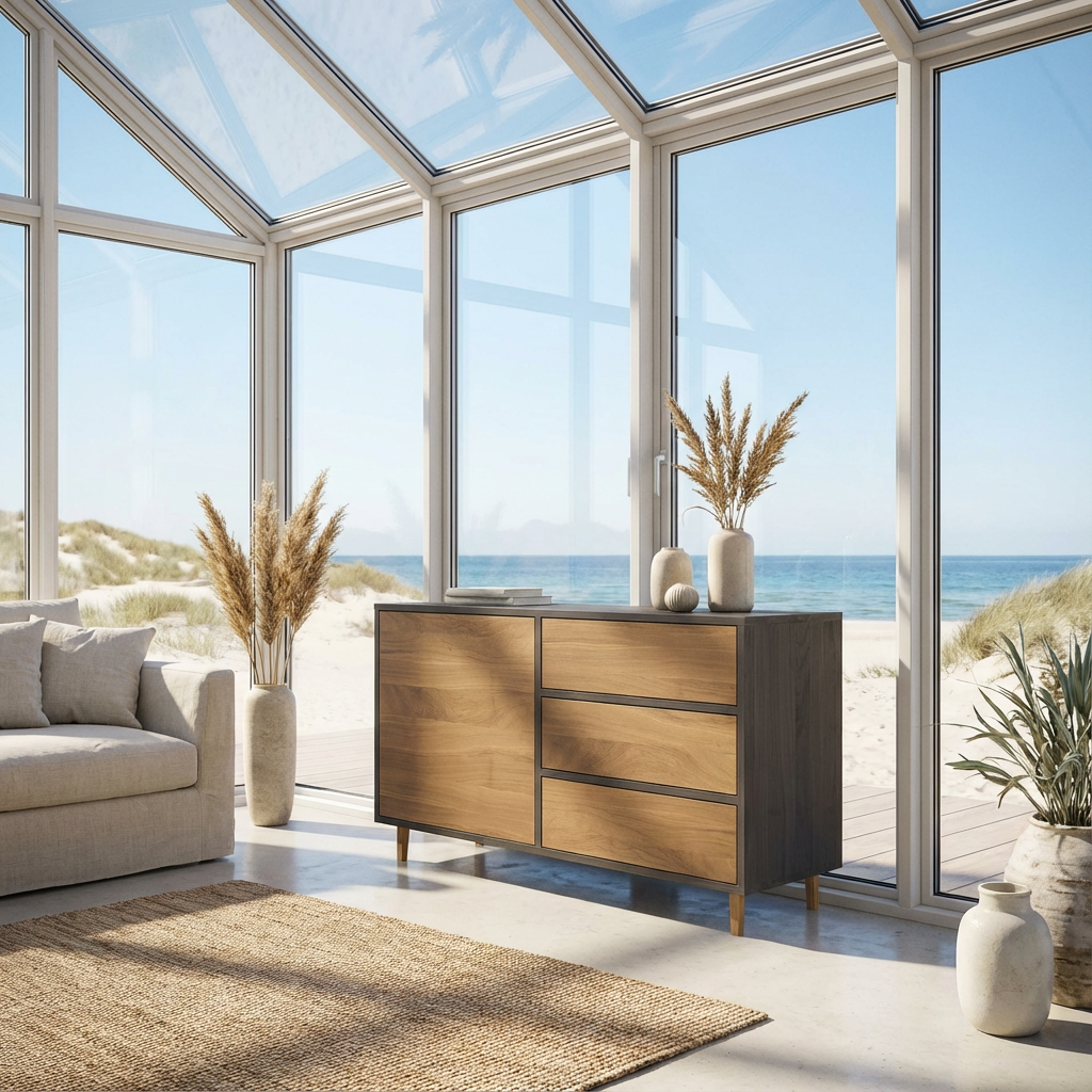 Premium-Eiche verleiht dem Board eine ruhige, klare Ausstrahlung. Die Maserung ist fein und gleichmäßig, der Astanteil bewusst gering. Flächen wirken harmonisch und ausgewogen, ohne ihre Natürlichkeit zu verlieren. Das Möbel strahlt Wertigkeit aus – zurückhaltend, präzise und zeitlos.
